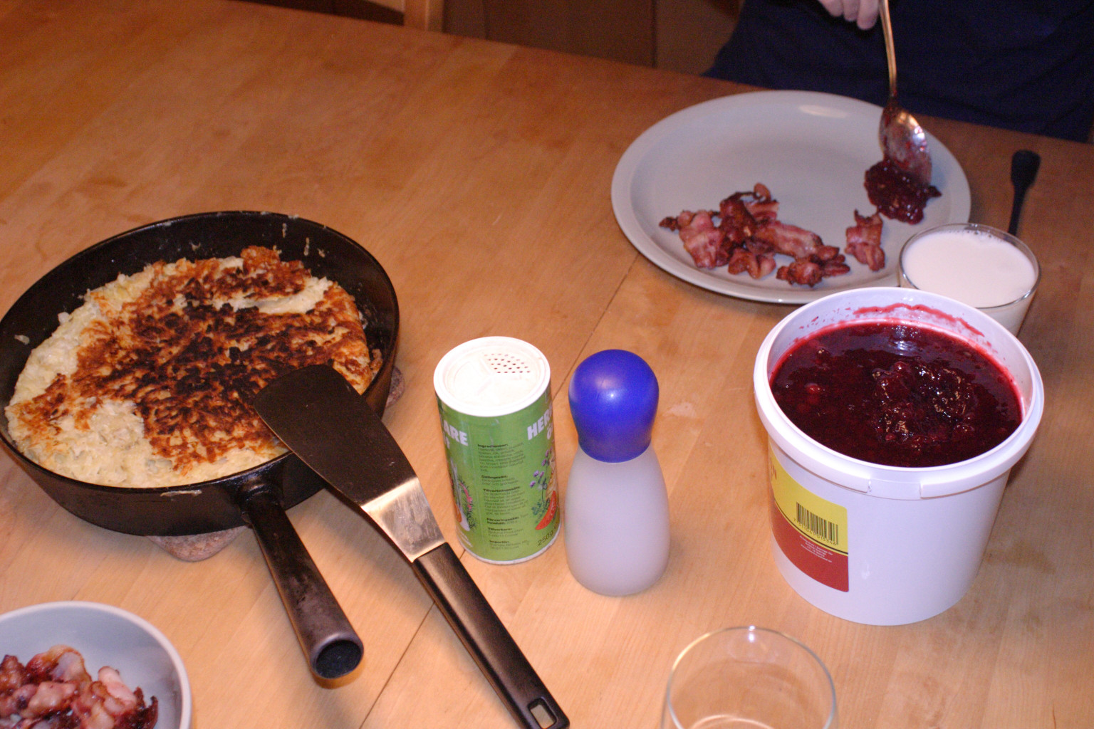Efter ca 15 minuter är det dags att vända kakan. Tag en tallrik som är större än stekpannan. Tag stekpannan av plattan, tag av locket och lägg på tallriken. På med stekvantar eller grytlappar och vänt stekpannan snabbt så att inget fett rinner ut. Ställ tillbaka stekpannan och låt kakan glida ner. Stek i ytterligare ca 10 min.