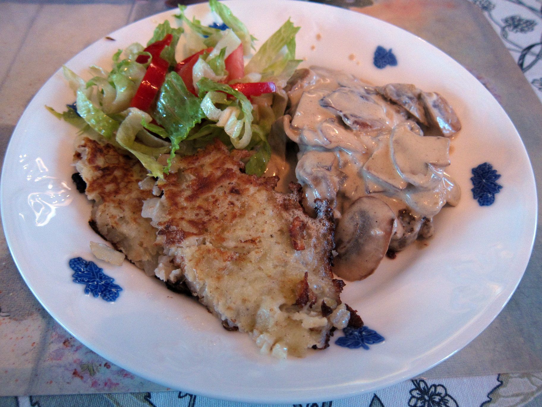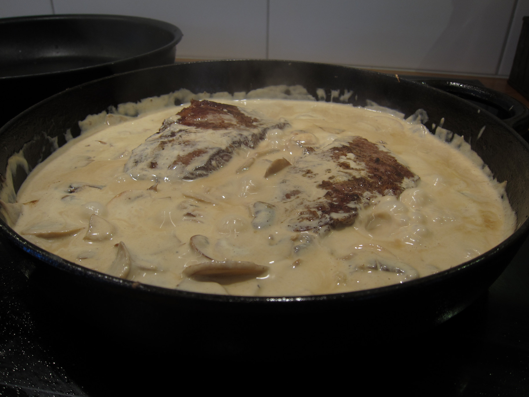 På hög värme och med lite mer smör så steker du champinionerna tills de vätskat ur sig och vätskan kokat in.