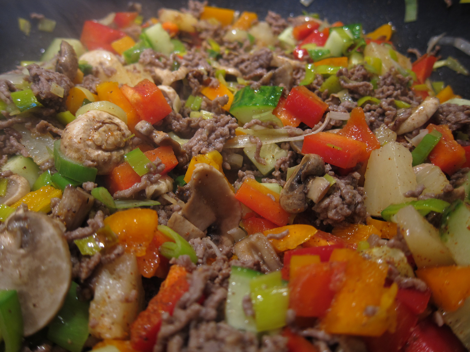 Fräs färs, strimlad purjolök och skivade champinjoner