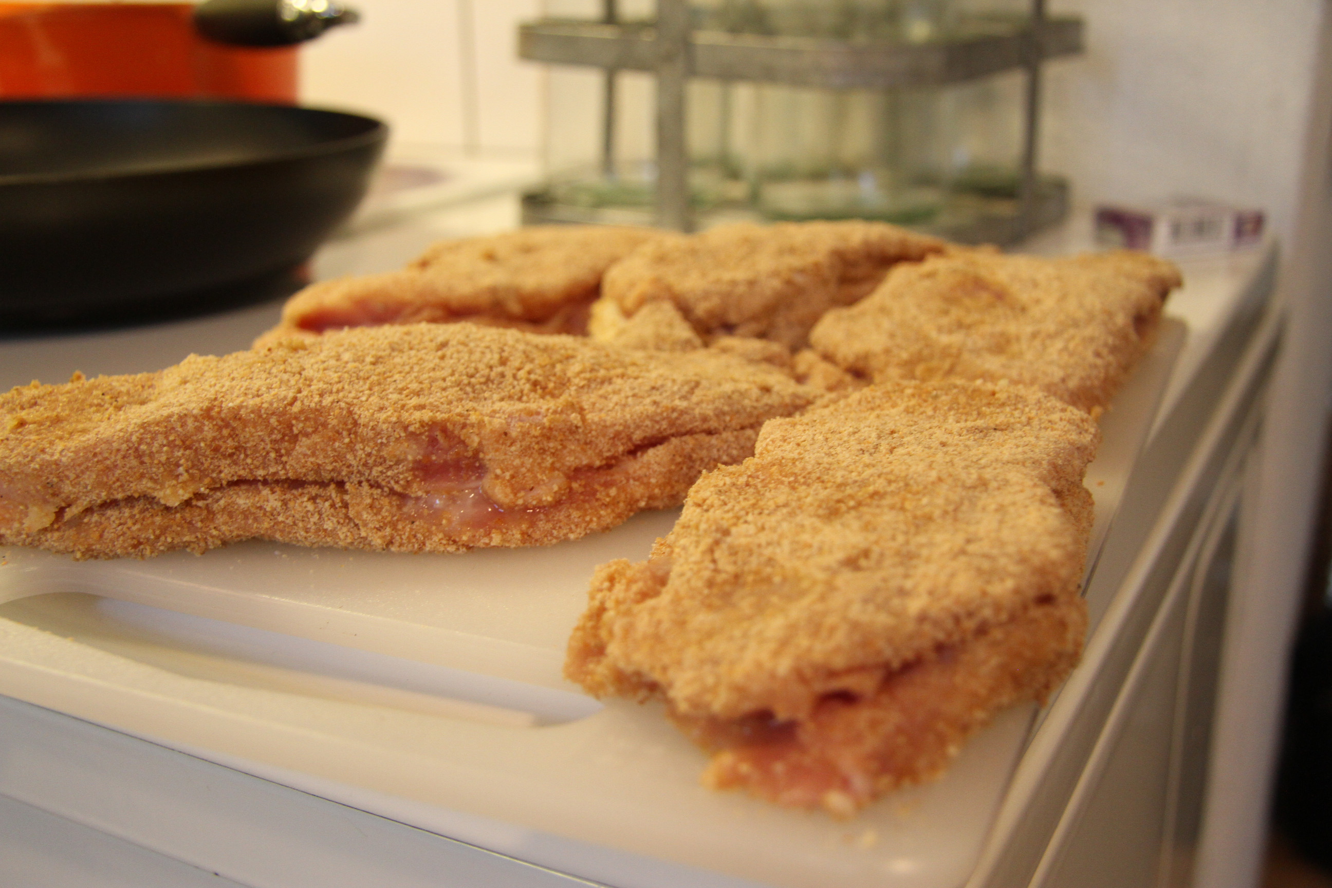 Tag en 'mjölad' schnitzel och doppa i äggen och sedan i ströbrödet. Lägg åt sidan.
