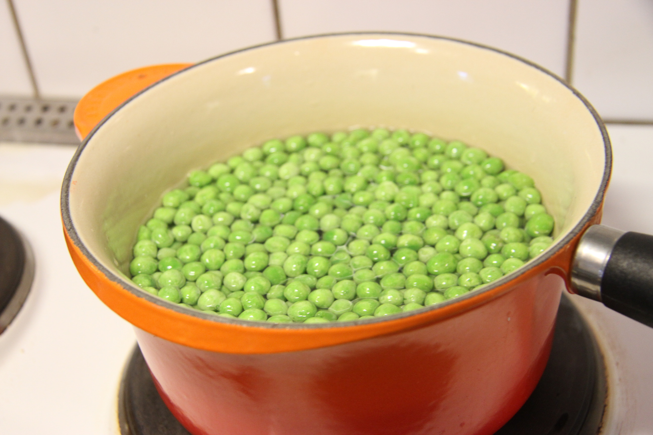 Värm de frysta ärtorna.