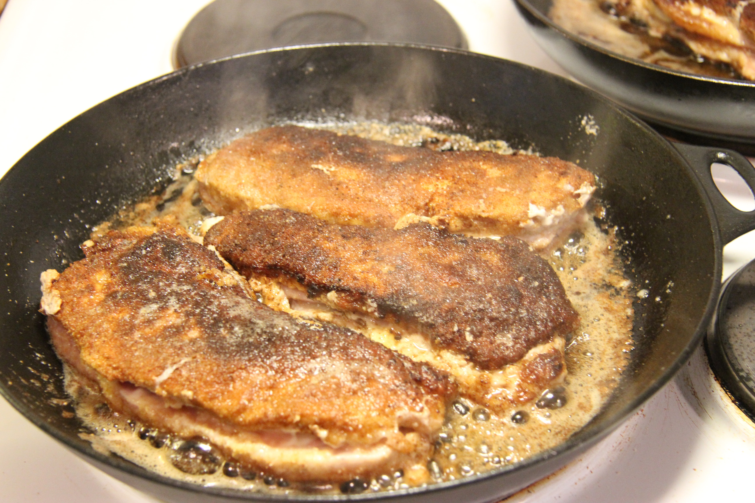 Doppa schnitzlarna i mjölblandningen, båda sidor ska vara vita, och lägg åt sidan.