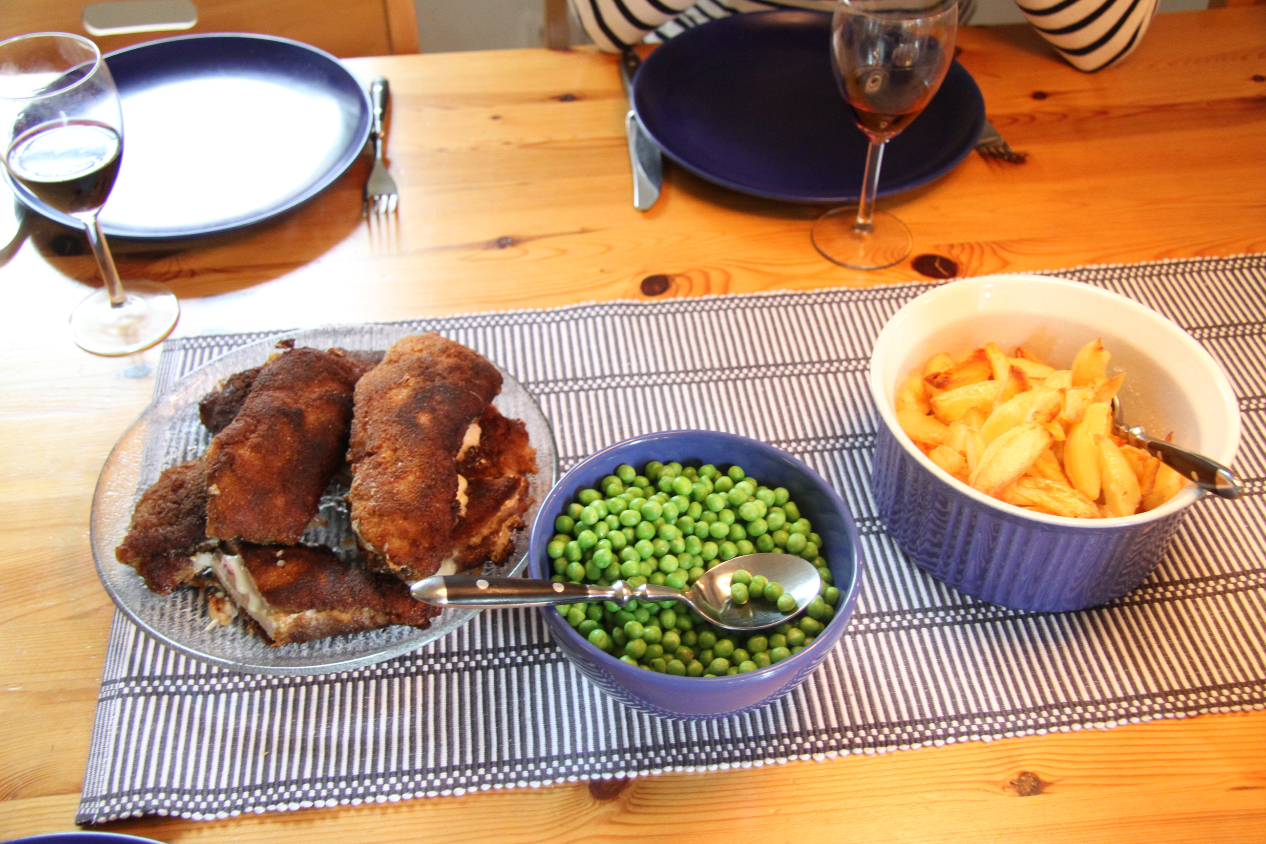 Servera med ärtor och klyftpotatis och kanske en grönsallad.
