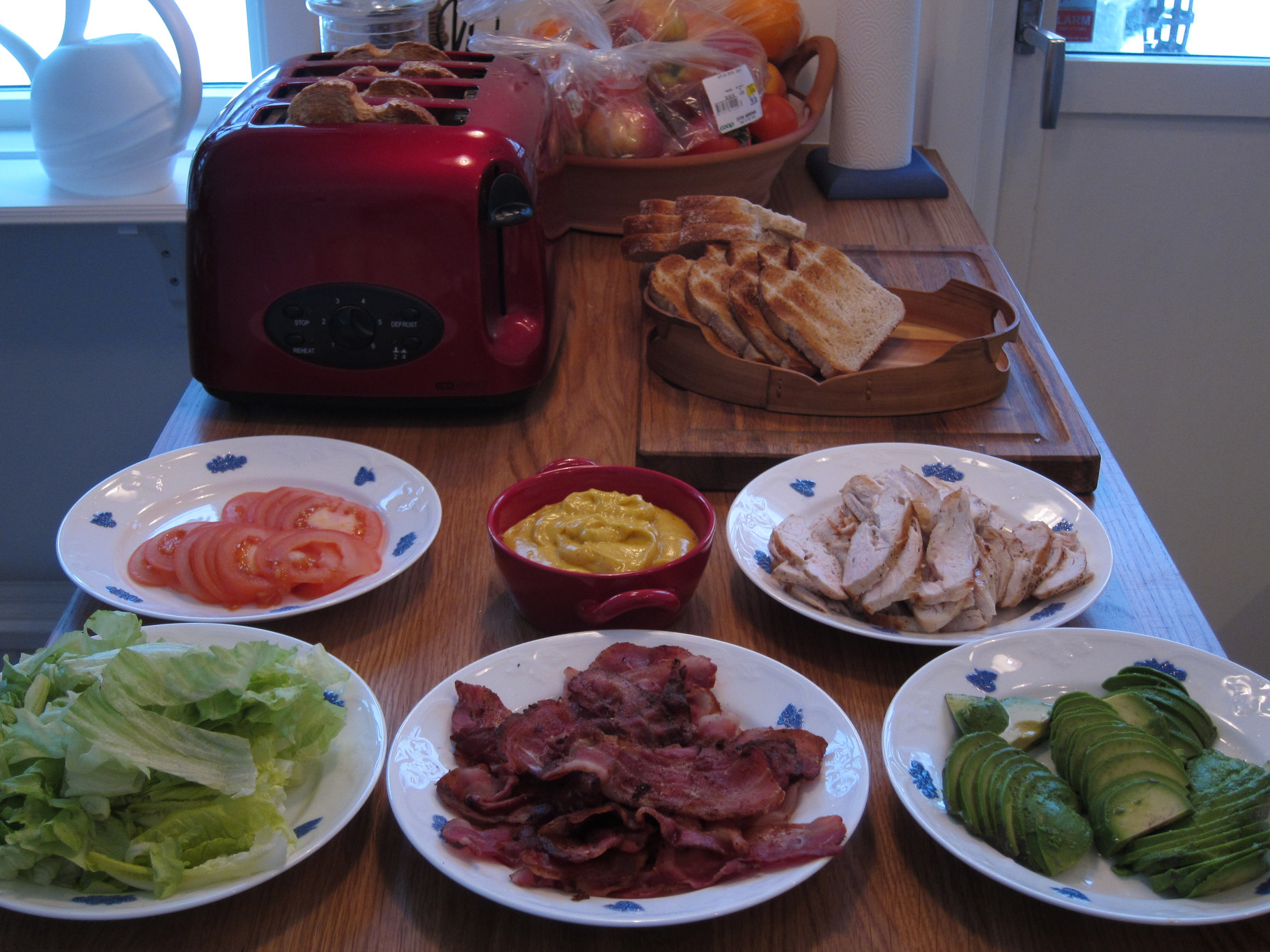 Dags att lägga ihop sandwitchen. Bred majonnäs på skivorna som inte är delade. På en tallrik, börja med en skiva bröd och täck den med sallad och sedan kyckling. Lägg på nästa skiva och täck den med sallad, tomatskivor, avokado. Lägg två bacon i ett kryss. Täck med de diagonalt skurna bitarn. Om du vill att det ska hålla ihop kan du använda tandpetare.
