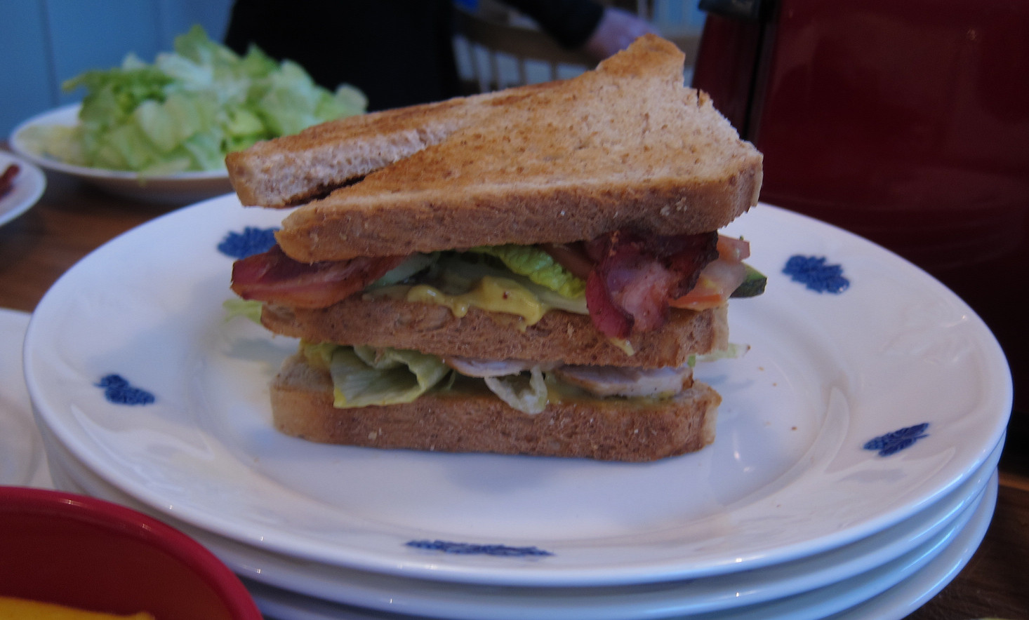 Anna Bergenström var ju min andra "lärare" efter mamma. Vi har de flesta av hennes kokböcker och har använt en del av dem väldigt flitigt. Detta recept kommer från Under valnötsträdet. Efter att ha sett club sandwich på pubmenyer utan att någonsin beställa så letade jag efter ett recept i boken och hittade detta. Jag har modifierat lite grann genom att tillsätta curry i majonnäsen - det blir smaskens.