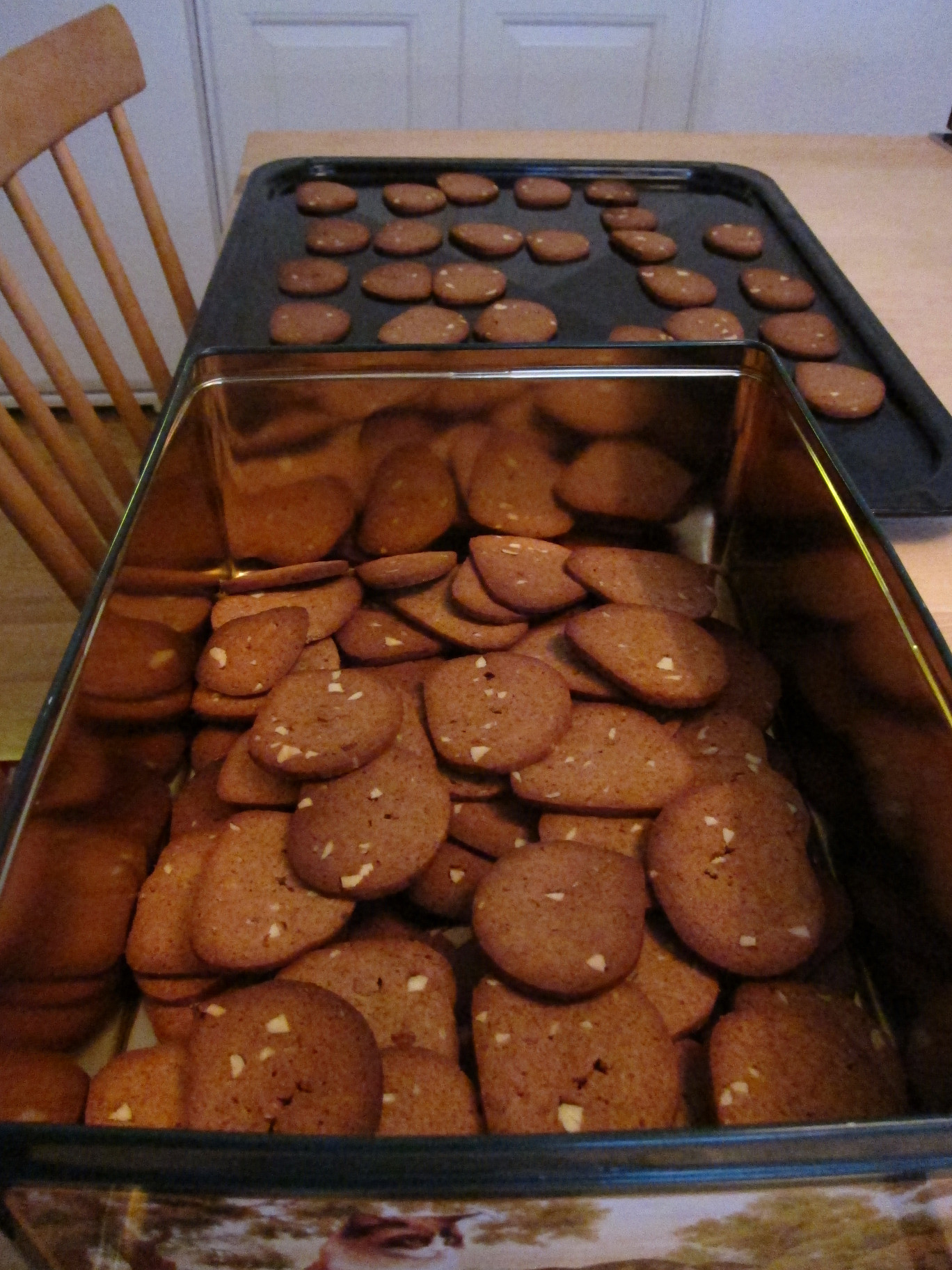 Efter de har svalnat något på plåten så läggs kakorna i burkar. Låt burkarna stå utan lock några timmar tills kakorna svalnat helt.