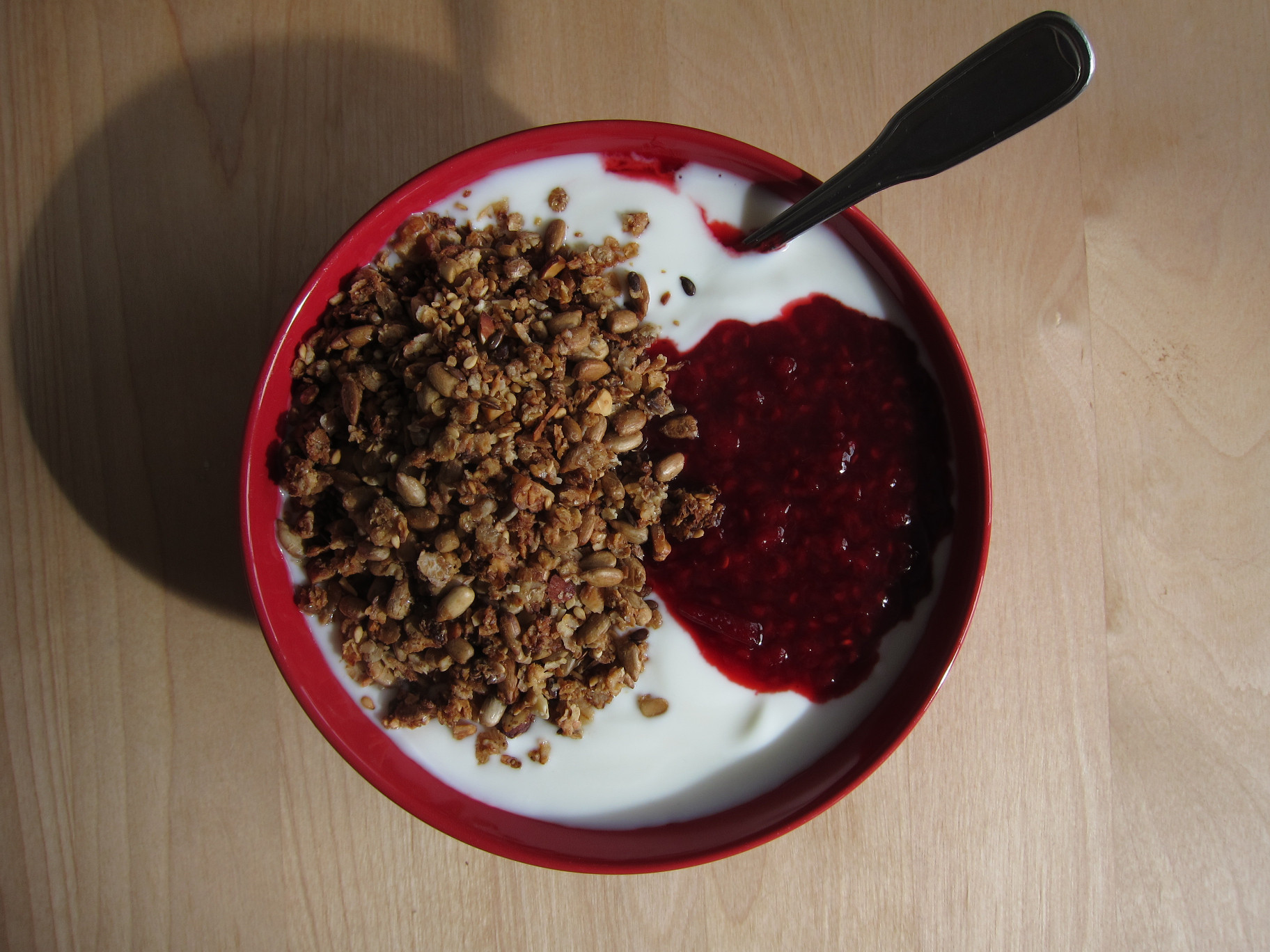 Denna müsli är numer standard till frukost. Vi provde någon gång med köpt - den fick fåglarna! Till denna müsli serverar vi hallonsylt. Hallonsylten är inte hållbar så det bygger på att man kan frysa det som man inte använder för tillfället. I kylskåp så håller sig sylten minst två veckor.